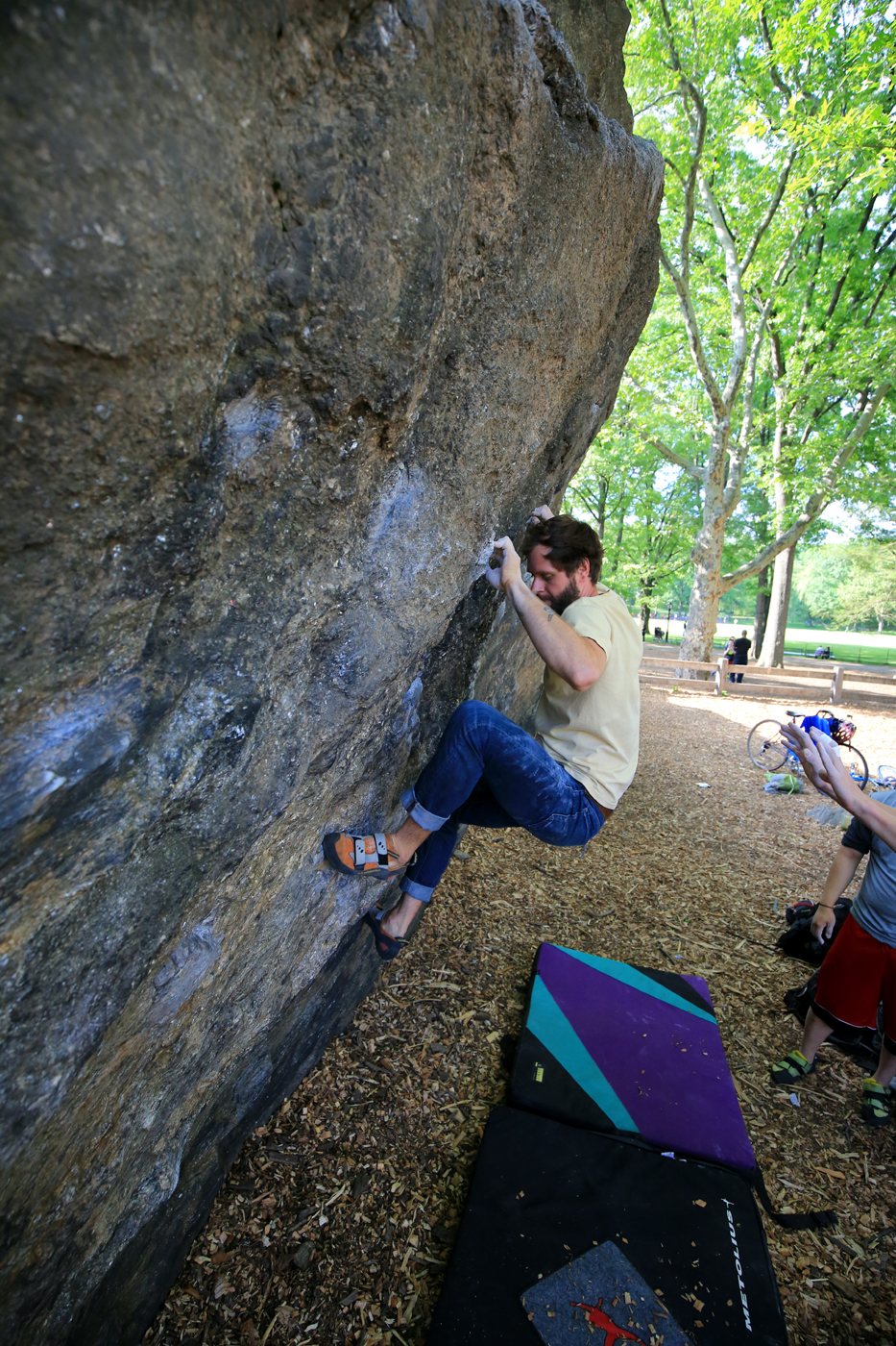 with eliminates and more direct powerful moves. For many years the hardest problem in the park. Crimpy and powerful.